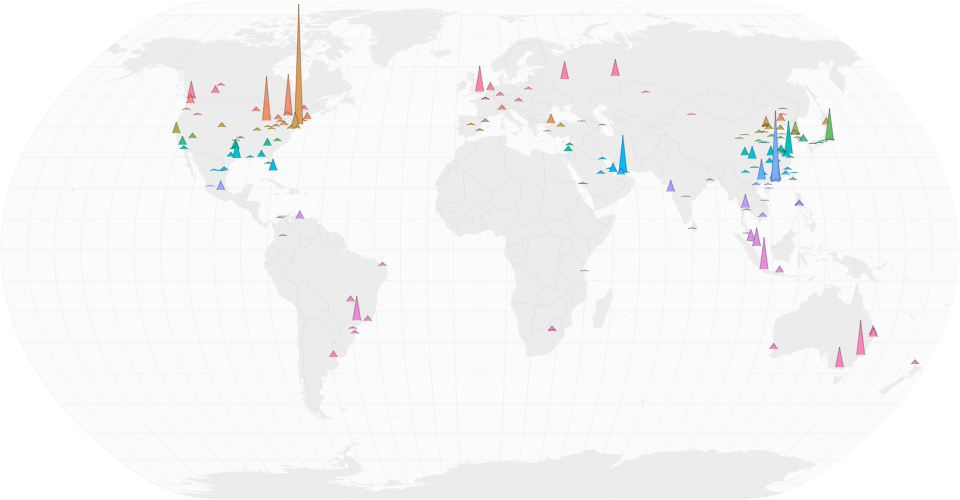 A world map showing cities with number of completdh highest structures greater then 100 meters high