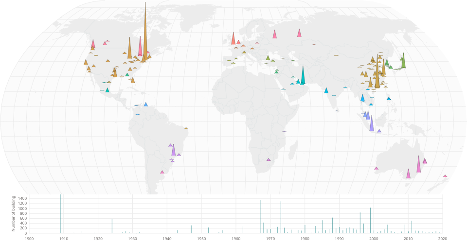 A world map showing the number of completed highest structures in cities. The building should be greater than 100 meters high to be counted.