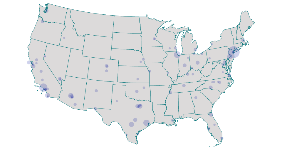 I used the U.S. Geo Map of State Boundaries for the underlying map. In this iteration, I used the geoAlbers projection to clean up and zoom in on the map. While other projection types appear to gracefully handle a lat/long input of 0, it returns null with this projection, which causes a fatal error when you reference the scaled pixel locations.