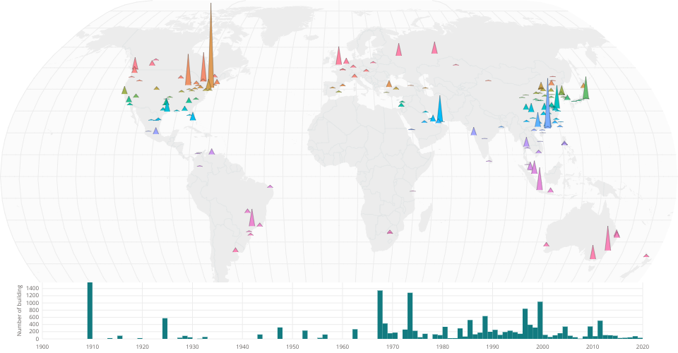 A world map showing the number of completed highest structures in cities. The building should be greater than 100 meters high to be counted.