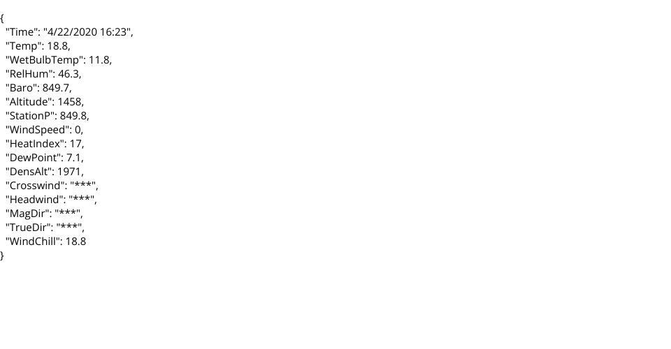 Device Information:,,,,,,,,,,,,,,, Name:,WEATHER - 2492848,,,,,,,,,,,,,, Model:,5500L,,,,,,,,,,,,,, Serial:,2492848,,,,,,,,,,,,,, Firmware:,1.31,,,,,,,,,,,,,, Profile Version:,0.06,,,,,,,,,,,,,, Hardware Version:,Rev 14,,,,,,,,,,,,,, LiNK Version:,1.04.04,,,,,,,,,,,,,, ,,,,,,,,,,,,,,, Time,Temp,Wet Bulb Temp.,Rel. Hum.,Baro.,Altitude,Station P.,Wind Speed,Heat Index,Dew Point,Dens. Alt.,Crosswind,Headwind,Mag. Dir.,True Dir.,Wind Chill yyyy-MM-dd hh:mm:ss,Celsius,Celsius,%,mb,Meters,mb,m/s,Celsius,Celsius,Meters,m/s,m/s,Degrees,Degrees,Celsius 4/22/2020 16:23,18.8,11.8,46.3,849.7,1458,849.8,0,17,7.1,1971,,,,,18.8