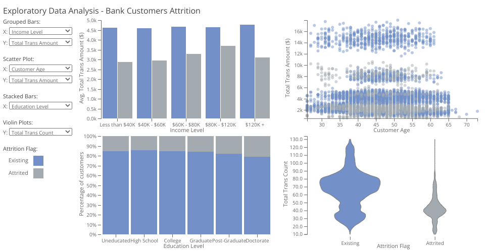 It consists of 4 dynamic plots. A grouped bar chart, scatter plot, stacked bar chart and violin plots. The attrition status of the bank customers is encoded on the color of the elements.