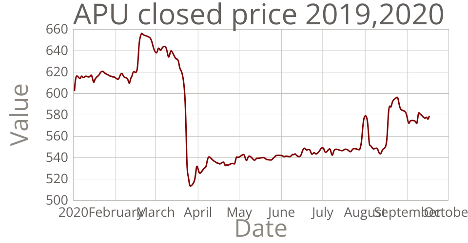 This line chart shows data about closed price of APU in 2019 and 2020.