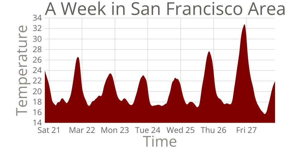 This line chart shows one week of temperature (in degrees Celcius) in San Francisco. The data comes from Data Canvas - Sense Your City