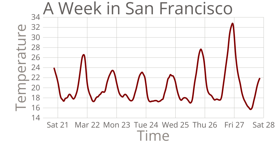 This line chart shows one week of temperature (in degrees Celcius) in San Francisco. The data comes from Data Canvas - Sense Your City