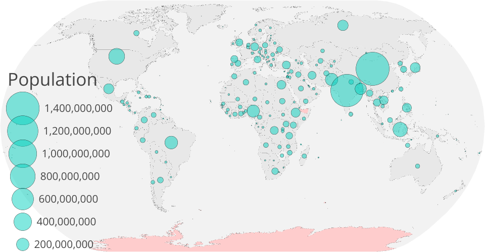 Visualizing population by country using circles on a map! The area of each circle corresponds to the population of the country it represents. You can also pan & zoom, and hover over each country for more information.
