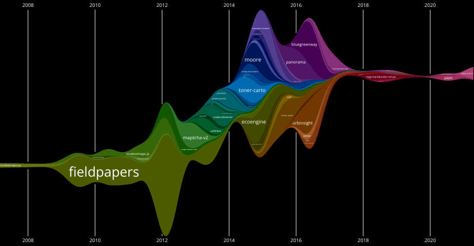 This is an experiment in visualizing Stamen's Open Source activity over the years. Each layer is a D3 repository. The thickness of each layer is the number of commits per week with smoothing applied. This visualization uses a modified Streamgraph technique where the layer order is determined by the time of the first commit. So, as you read the labels from bottom to top, that corresponds to the history of when each repository was introduced.