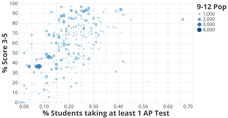 Bubble chart showing Massachusetts HS participation rates compared to success (AP scores 3+). Color and size show the size of the Massachusetts High School.