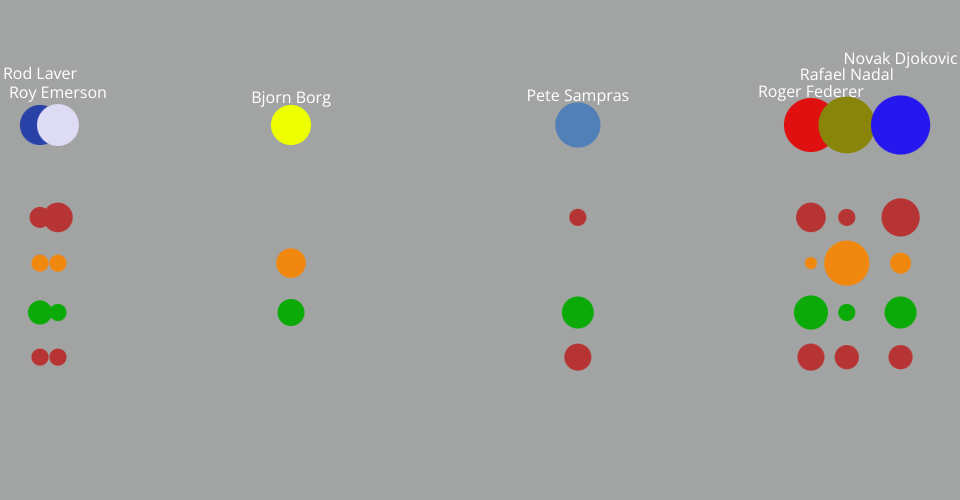 A visualization of the top 7 mens tennis players based on Grand Slam Wins. -The placement on the X direction represents the year a player turned pro (starting at 1960 to 2008) -The size of the circle represents how many Grand Slams that player won: Vertically, starting from total titles followed by Australian Open, French Open, Wimbledon, and US Open titles in that order. -The colors of the tournament circles represent the surface (red=hard, orange=clay, green=grass)
