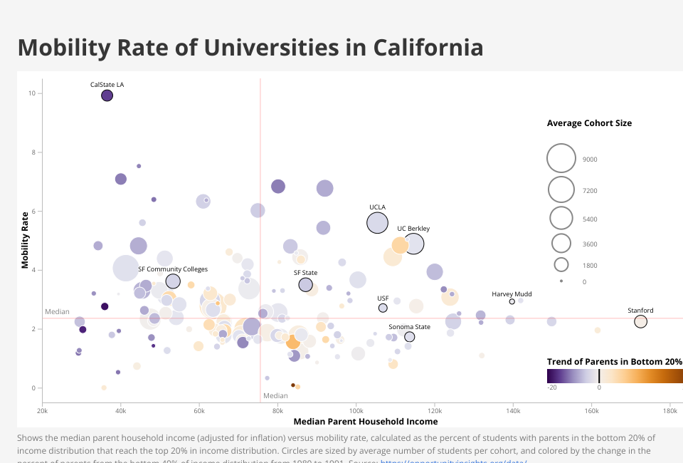 Median Parent Household Income vs. Mobility Rate. Color shows details about Trend of Parents in Bottom 20%. Size shows details about Average Children per Cohort. The marks are labeled by College Name. The data is filtered on State, which keeps CA.