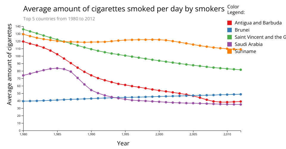 Multi-line Chart visualization of the average amount of cigarettes smoked per day by smokers of only top 5 countries from the CORGIS dataset 'https://corgis-edu.github.io/corgis/csv/smoking/' in D3. Color legend from Susie Lu and colorbrewer.