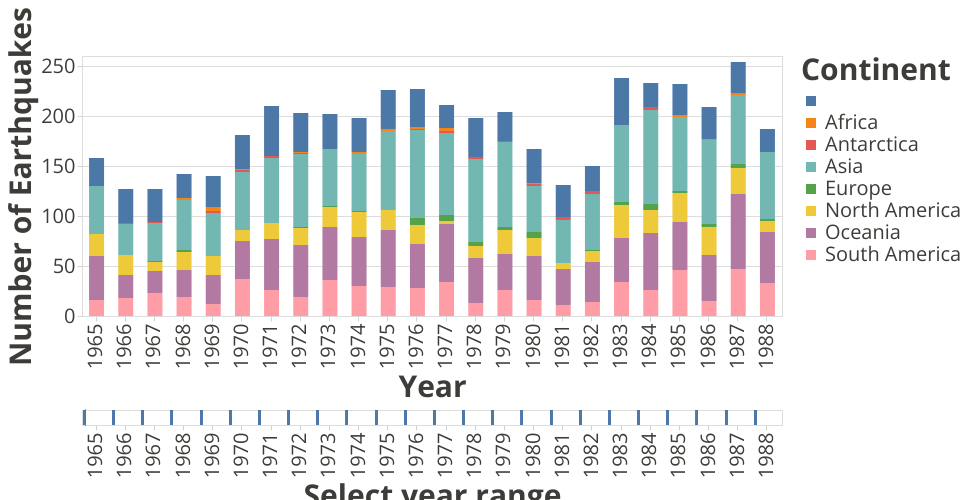A bar graph showing number of earthquakes across all continents since 1965 to 1988 (a realization of my second sketch) constructed using the vega-lite-api. The Significant Earthquakes from 1965 dataset has been used for this visualization. This dataset contains information of earthquakes all over the world that took place from 1965. Dataset obtained from Kaggle.