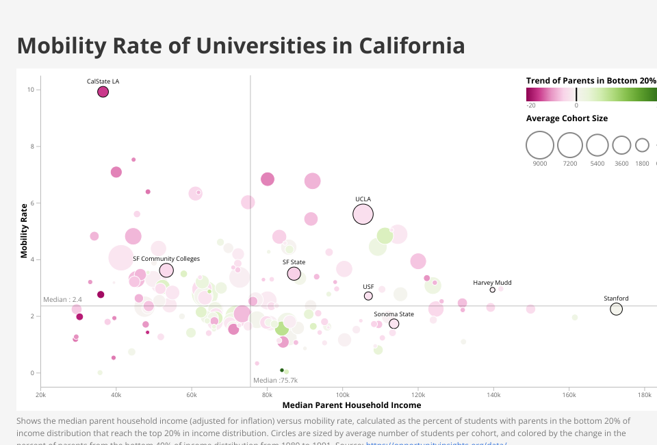 Median Parent Household Income vs. Mobility Rate. Color shows details about Trend of Parents in Bottom 20%. Size shows details about Average Children per Cohort. The marks are labeled by College Name. The data is filtered on State, which keeps CA.