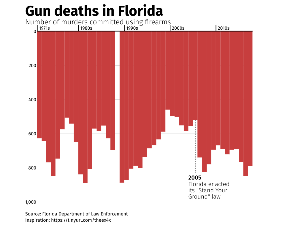 The original visualization appeared in the article This Chart Shows An Alarming Rise In Florida Gun Deaths After 'Stand Your Ground' Was Enacted article by Pamela Engel on Business Insider on February 18, 2014.