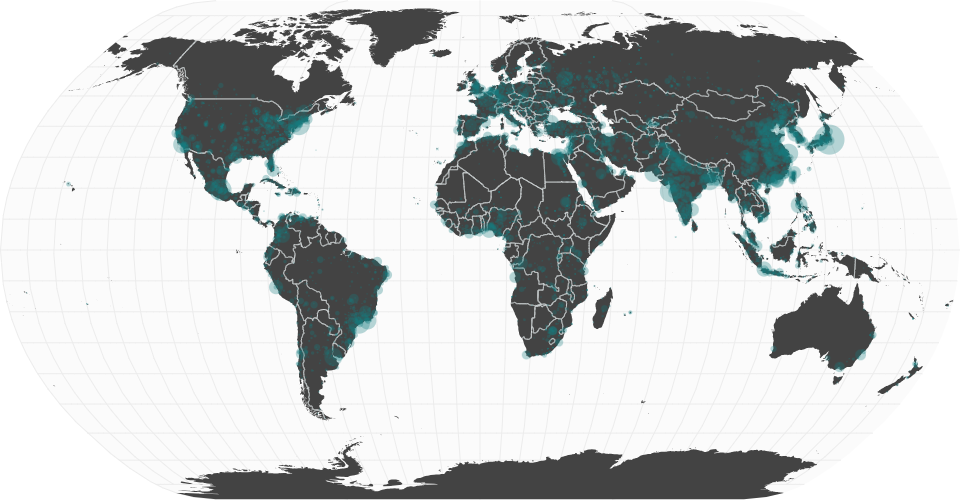 A world map showing cities with population greater than 50,000. City data from Simplemaps: World Cities Database.
