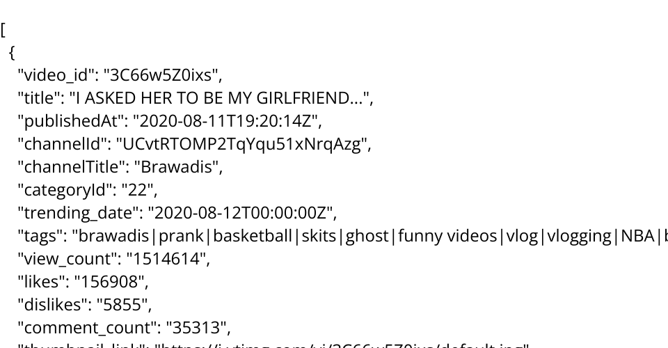 This data set contains data on YouTube tranding videos from August 2020. The source dataset is large, so I took the first 1000 rows. Original source: https://www.kaggle.com/datasets/rsrishav/youtube-trending-video-dataset?select=US_category_id.json