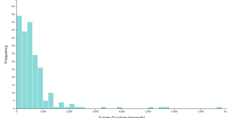 A histogram of duration of my MQP dataset with simple axes, using the d3 histogram basic tutorial with tooltips from Map of top-rated restaurants in Greater Boston.