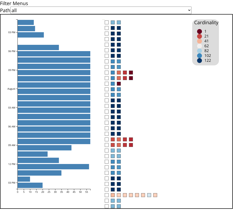 Each row represents a sequence of GUI widgets from the root widget to the inner-most child widget. Clicking on a node will highlight the event sequence it belongs to and popup a description of the sequence (IDs starting from root to child nodes). Future versions will need a more diverse dataset and scrolling to allow for hundreds of sequences.