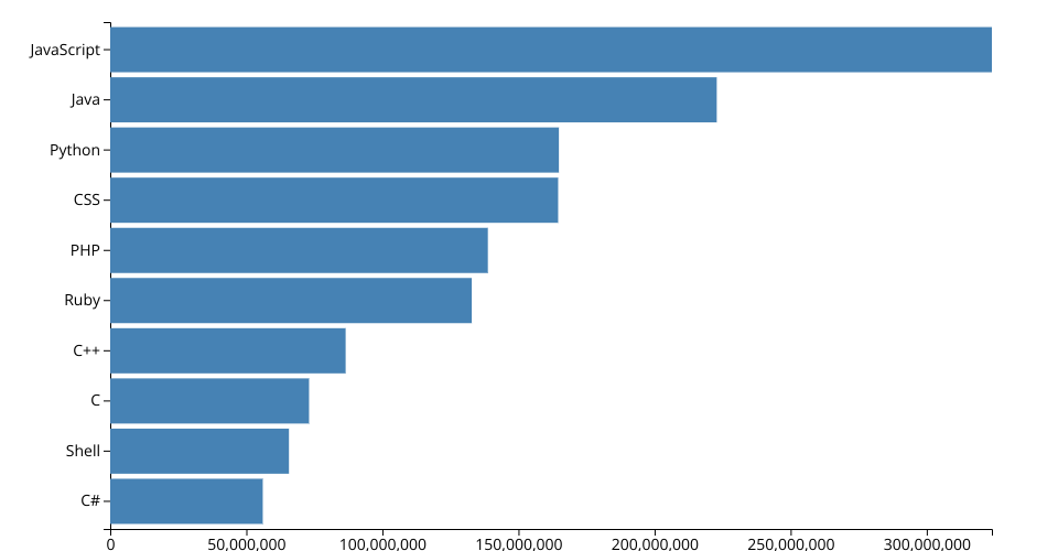 These data are represent the top programming languages according to the number of corresponding active repositories on GitHub. The data was taken from GitHub's publically available datasets available through an API or through their archive.