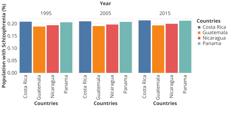 The idea behind this visualization was to show the percentage of the population of Costa Rica, Guatemala, Nicaragua and Panama who has suffered from schizophrenia over the years.