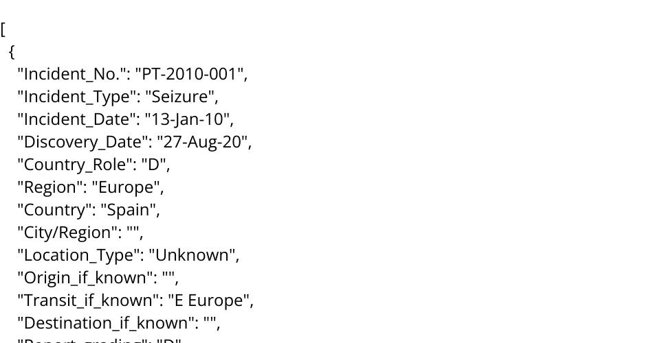 Column Name Type Key Information Incident No. Quantitative Incident Type Categorical "Animal Injury / Mortality / Welfare Possession/trade Seizure" Incident Date Quantitative Discovery Date Quantitative Country Role Categorical "O = Origin T = Transit D = Destination" Region Categorical Country Categorical City/Region Categorical Location Type Categorical Origin if known Categorical Transit if known Categorical Destination if known Categorical Report grading Ordinal "A = True B = Second hand but source known C = Unknown but corroborated D = Unable to Judge E = Suspected false" Verif means Categorical Ultimate source type Categorical "A = Primary B = Secondary" Ult. Verif. Source Categorical Description Ult. Source Reliability Categorical "A = always B = mostly C = fairly D = sometimes E = unreliable F = unknown" Orig. Source Type Categorical "A = Original research B = Official C = Open source D = Direct Report" Medium Categorical Original Source Categorical Day Quantitative Month Quantitative Year Quantitative Day (+/-) Quantitative When exact date not known Month (+/-) Quantitative When exact date not known Num Cheetahs Categorical Units Categorical "Bushmeat Claws Head Live Other Skin Skin pieces Skull Stuffed Teeth Trophy" Incident Description Categorical Confiscated Quantitative # of units if known Surrendered Quantitative Alive Quantitative # live units at or post confiscation Died Quantitative # death units at or post confiscation LTF/ UNK Fate Quantitative # units lost to follow up Action Taken Categorical Outcome Categorical Detecting agency Categorical POI Assigned ID Quantitative Suspects, person of interest Other info / URL Categorical URLs