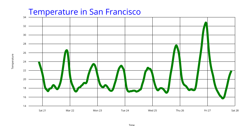 This line chart shows one week of temperature (in degrees Celcius) in San Francisco. The data comes from Data Canvas - Sense Your City.