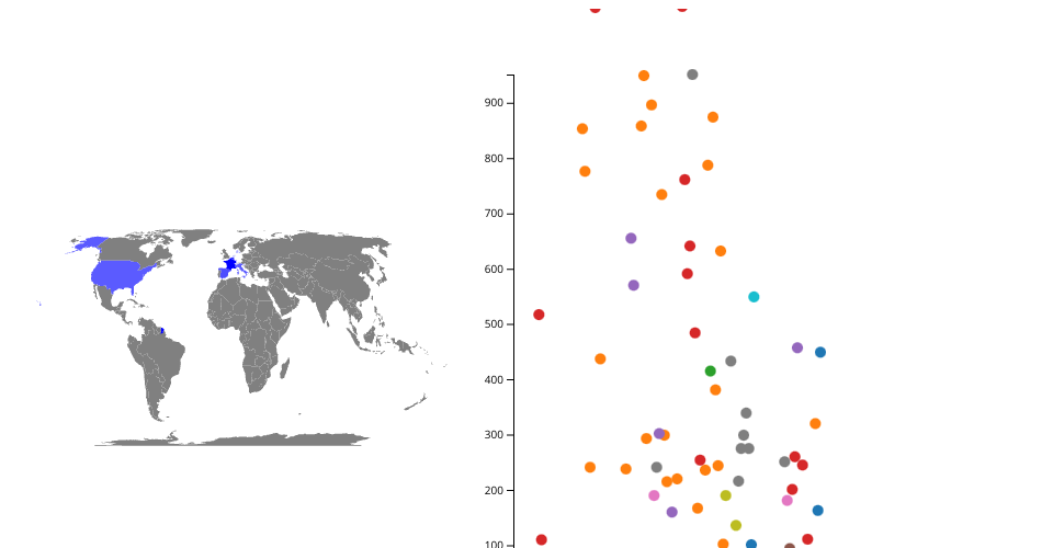 This file is not finalized at all but is more of a proof on concept. Try mousing over dots and countries to see how the linking works. Mosuing over a country selects all from that country, whereas a dot, slects just that dot and the country.