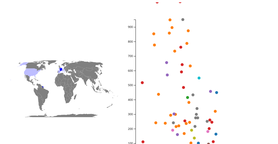 This file is not finalized at all but is more of a proof on concept. Try mousing over dots and countries to see how the linking works. Mosuing over a country selects all from that country, whereas a dot, slects just that dot and the country.