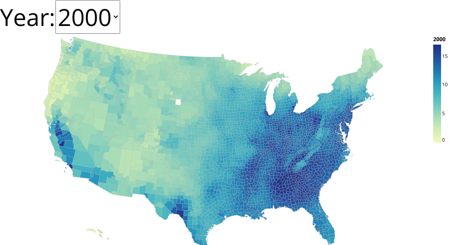 The source dataset of this visualization is PM2.5 by County. It shows the pm2.5 concentration of the US counties from 2000 to 2004.