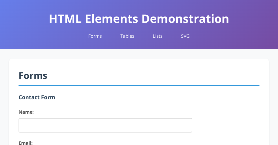 This project showcases the implementation of various HTML elements including forms, tables, lists, and SVG graphics with modern styling and interactive JavaScript functionality.