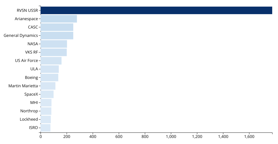 This bar chart shows mission counts of the top 15 most rocketing space companies since 1957. The data comes from the Deep Dive in the Space Race All Space Missions from 1957.
