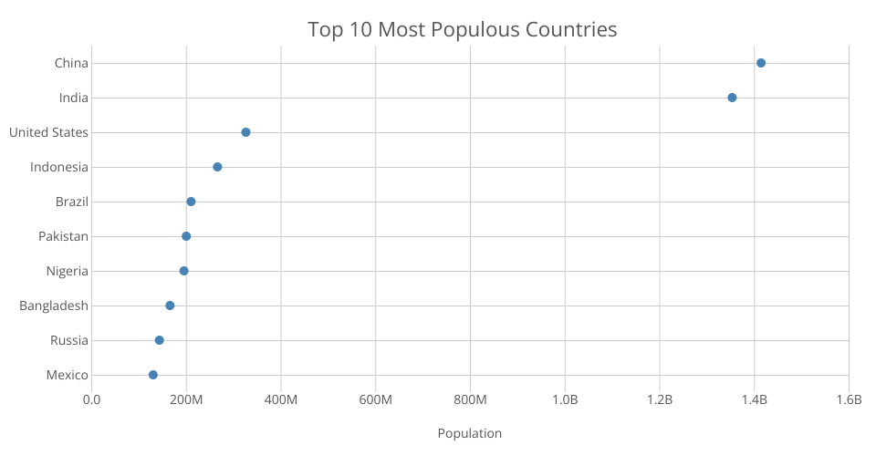 This bar chart shows population of the top 10 most populous countries. The data comes from the year 2018 estimate in World Population Prospects 2017.