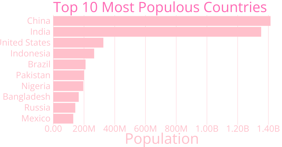 This bar chart shows population of the top 10 most populous countries. The data comes from the year 2018 estimate in United Nations: World Population Prospects 2017. It also demonstrates customization of D3 axes.