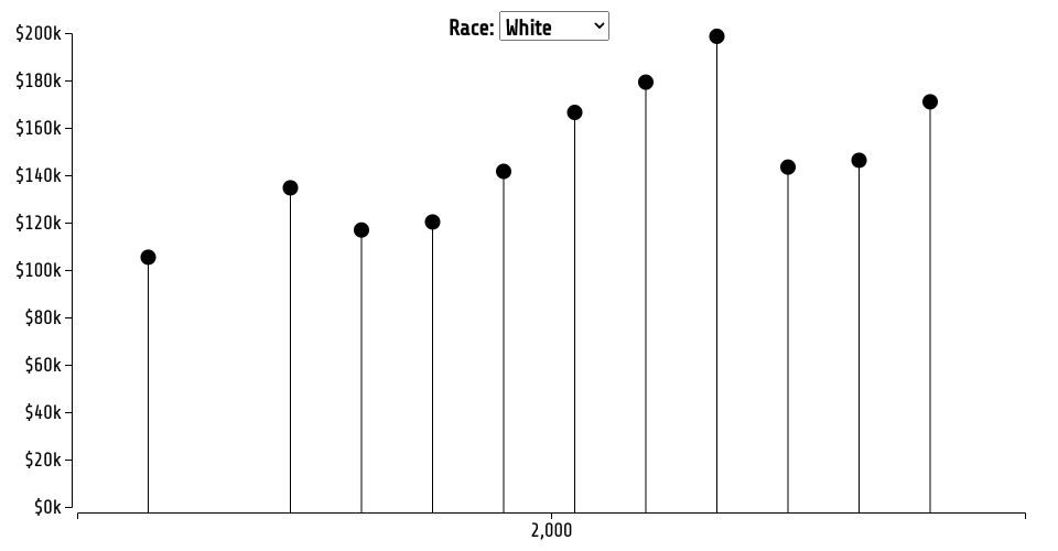 • The above chart explores the median family wealth of US households over the period 1983-2016 split by race.