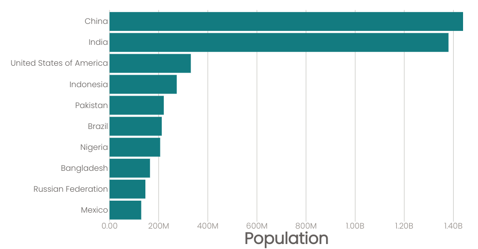 A program that shows the top 10 most populous countries as a pathetic bar chart with no axes.