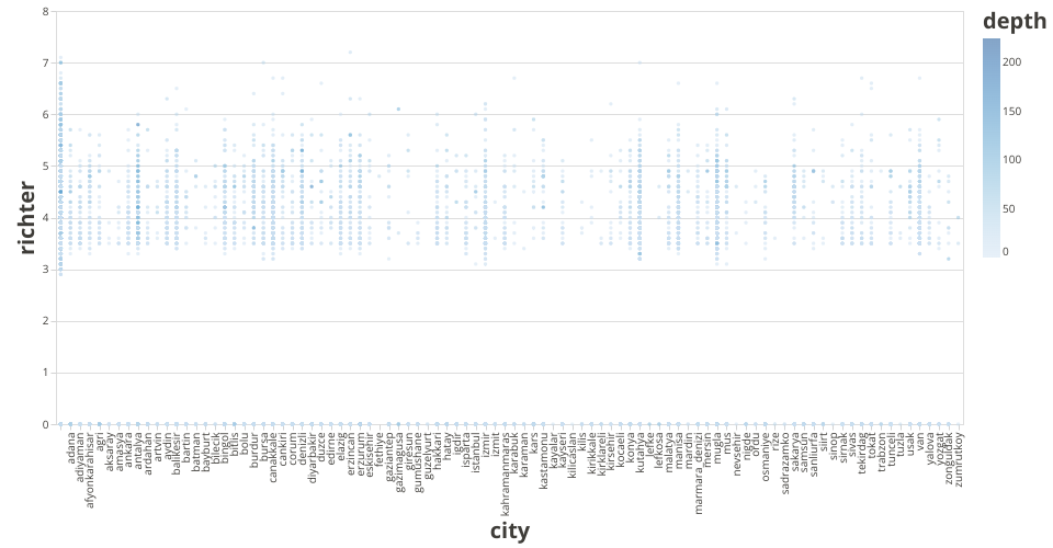 This data shows Earthquakes in Turkey. Each point represents an earthquake event. The x-coordinate represents the different cities, and the y-coordinate represents the earthquake magnitude. The depth of the point indicates the depth of the earthquake.