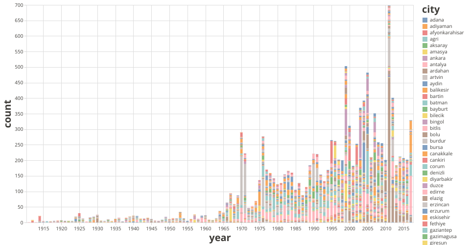 Year and city statistics of earthquakes in Turkey. The visualization shows Earthquake Data in Turkey. It's a bar plot. The X-axis represents the years, and the Y-axis represents the total number of earthquakes. Different colors represent different cities in Turkey.