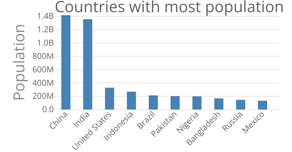 This bar chart shows population of the top 10 most populous countries. The data comes from the year 2018 estimate in United Nations: World Population Prospects 2017. It also demonstrates customization of D3 axes.