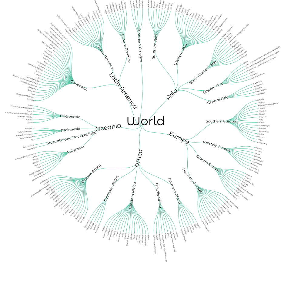 [World Countries Hierarchy](https://bl.ocks.org/curran/1dd7ab046a4ed32380b21e81a38447aa) [Radial Dendrogram](https://observablehq.com/@d3/radial-dendrogram)
