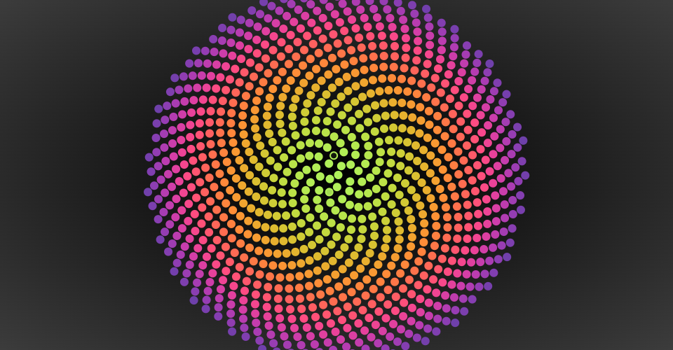 Svelte + D3: Phyllotaxis layout (irrational 2)
