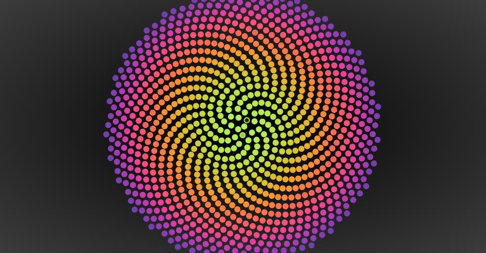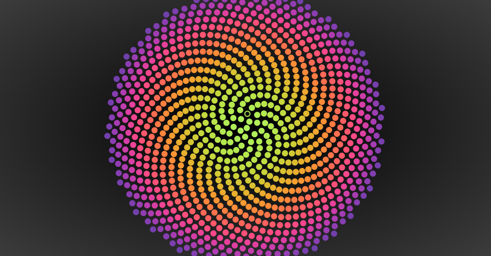 Svelte + D3: Phyllotaxis layout (irrational 3)