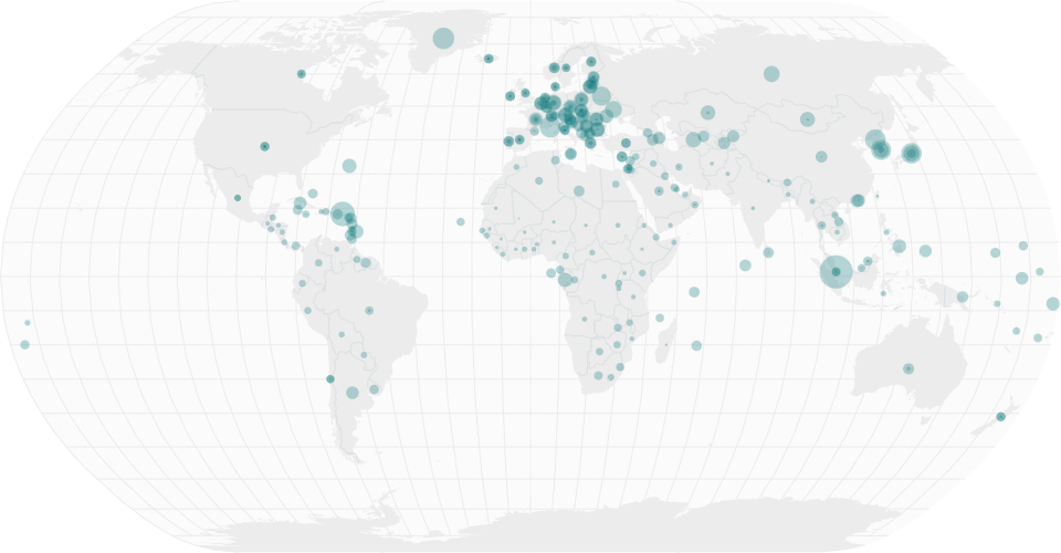 Country boundaries from World Atlas TopoJSON, polished for visual style, including graticules.