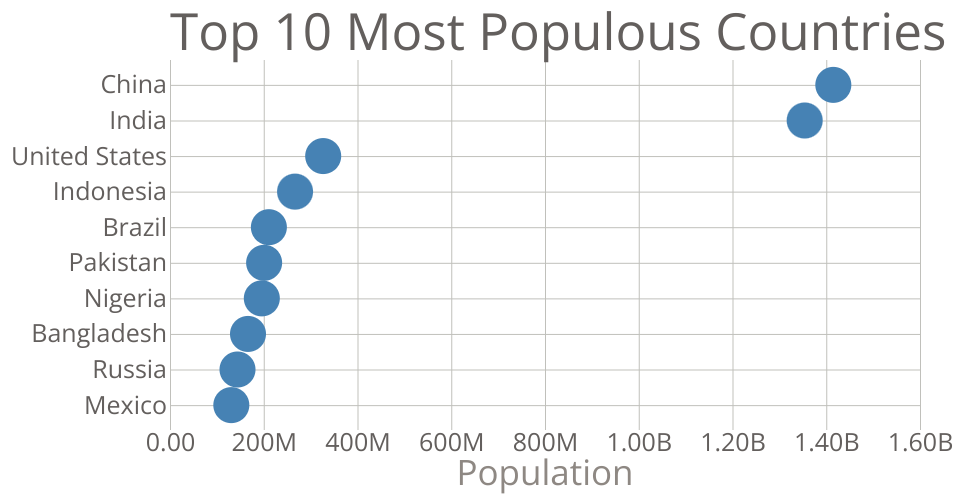 This bar chart shows population of the top 10 most populous countries. The data comes from the year 2018 estimate in United Nations: World Population Prospects 2017. It also demonstrates customization of D3 axes.