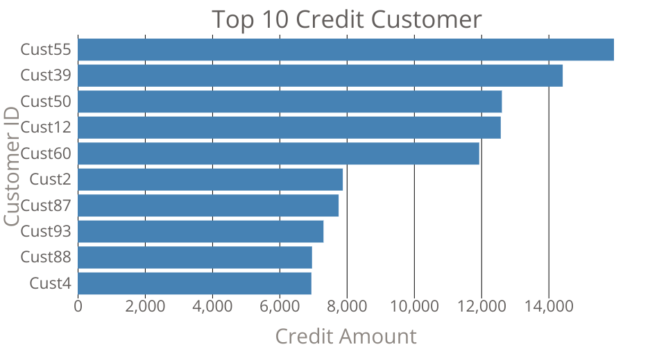 This is bar chart representation of my dataset that evalutaes credit risk of a specific customer based on certain criteria. Here the plot is showing top 10 customer who are awarded most credit.