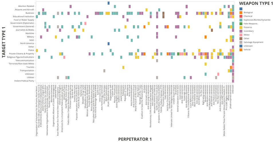 The viz shows the perpetrators who conducted crimes in the United States during 1975 to 2017 and their target type with corresponding weapon type.