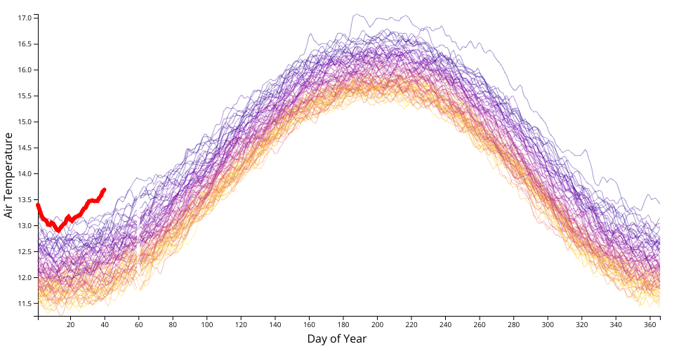 A visualization of Daily Surface Air Temperature, colored by year, with 2024 highlighted in red. Made in collaboration with EJ Fox, leveraging data prepared by Matthias Stahl.