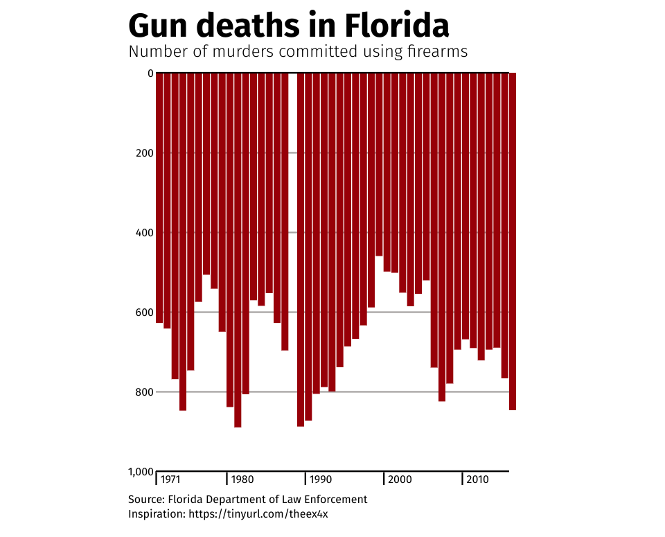 This block provides a rough re-creation of the Florida Gun Deaths visualization. Keeping in mind the inspiration and issues discussed, try to redesign this visualization. Focus first on editing the style (colors, thickness of lines, etc.) before changing the encoding or visualization technique.