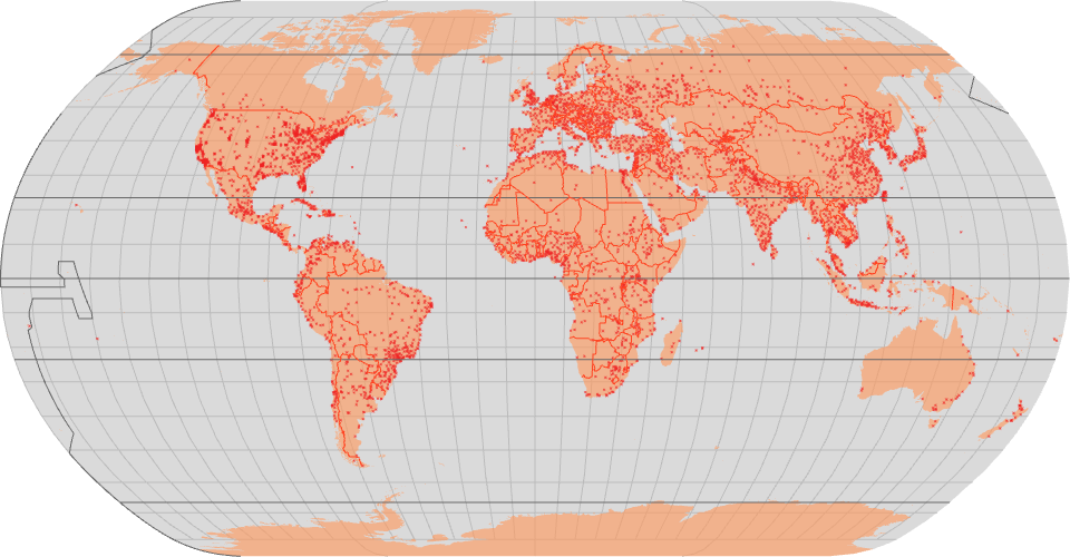 A world map showing cities with population greater than 50,000. City data from Simplemaps: World Cities Database.