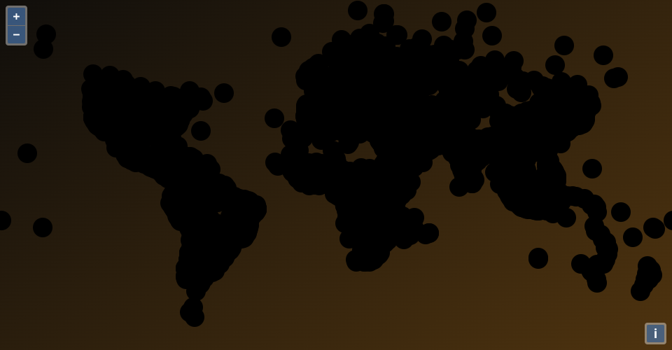 Each point is a city with population greater than 50,000. City data from Simplemaps: World Cities Database. Data loading logic drawn from Sized Points on a Map.