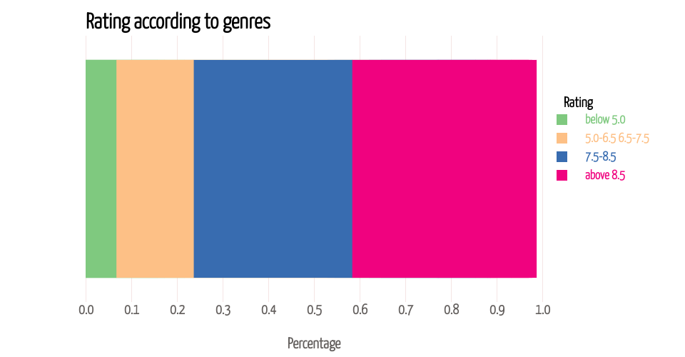 This stacked bar chart gives the percentage of each rating level within different movie genres. The aim is to show the impact of genre on movie ratings. When the mouse hovers over each bar, you can see pop-ups of accurate percentage of each rating level within each genre. Total percentage is 1, representing 100%.